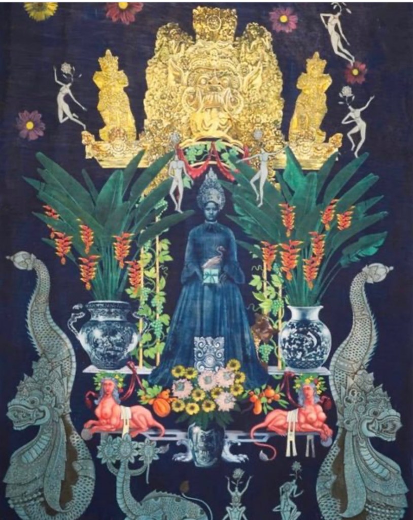 This work, Balinese Baroque, is currently displayed in Baroque Archipelago exhibition at Mizuma Art Gallery in Singapore. The image shows a Balinese Woman from 1930s tourism advertisement, dressed in European Dress. Around her are a variety of European invented concept of what is luxurious in the exotic tropics. According to the curator Tan Siuli, Budi is commenting on the ‘civilising influence’ of the west.