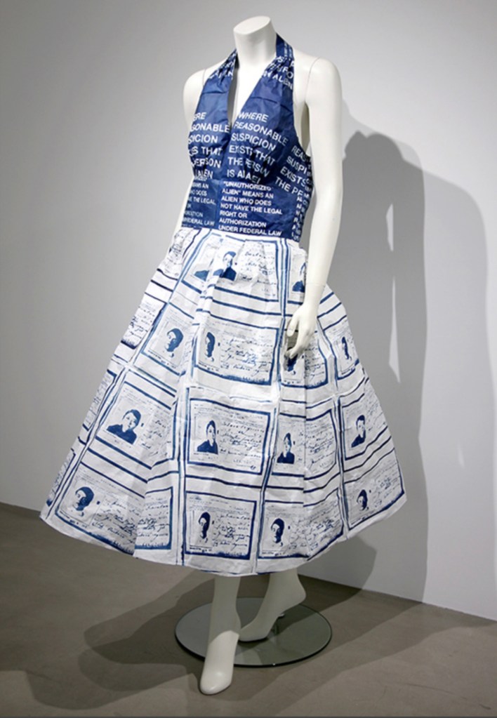 Relative Alien, by Annie Lopez. I am really interested in this work, a cyanotype-printed-dress constructed from Tamale wrapper paper. Tamale is Mesoamerican dish, made of corn masa flour, which is steamed in a corn husk or banana leaf. The skirt are covered by images of her grandparents’ US alien identification cards. Lopez. The work set to remind viewer of the challenges living in a border state as a person of Latin American origin. Displayed as a part of BLUE exhibition at Lisa Sette Gallery. Artist’s Website